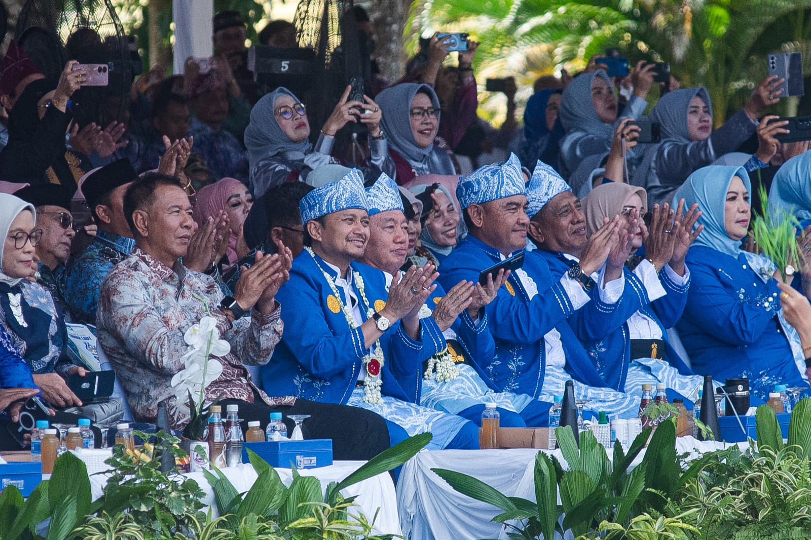 Dengan mengenakan baju adat Banjar bernuansa biru-putih, Gubernur Muhidin, sambutan meriah turut mengiringi langkah keduanya.