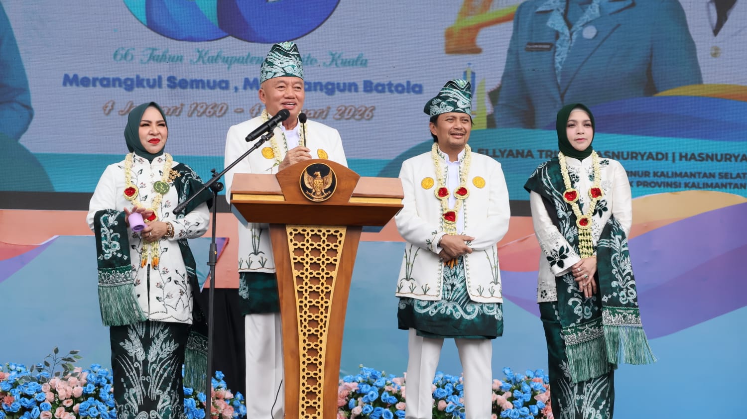 Marabahan – Gubernur Kalsel H Muhidin didampingi istri, Ketua TP PKK Kalsel Hj Fathul Jannah Muhidin, dan Wakil Gubernur Kalsel Hasnuryadi Sulaiman bersama istri Ketua BKOW drg Ellyana Trisya Hasnuryadi, turut menghadiri puncak peringatan hari jadi ke 66 Kabupaten Barito Kuala (Batola), Ahad (04/01/2026) di Stadion 5 Desember Marabahan.