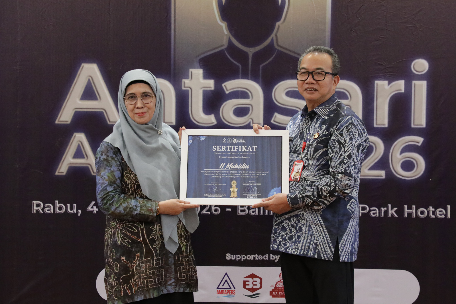 Pada Antasari Award 2026 yang mengusung tagline “Dari Mahasiswa, untuk Banua” ini, Gubernur Kalimantan Selatan H. Muhidin berhasil menerima penghargaan pada Kategori Kepala Daerah, sebagai ‘Gubernur Visioner dalam Pembangunan Berkelanjutan di Kalimantan Selatan’.
